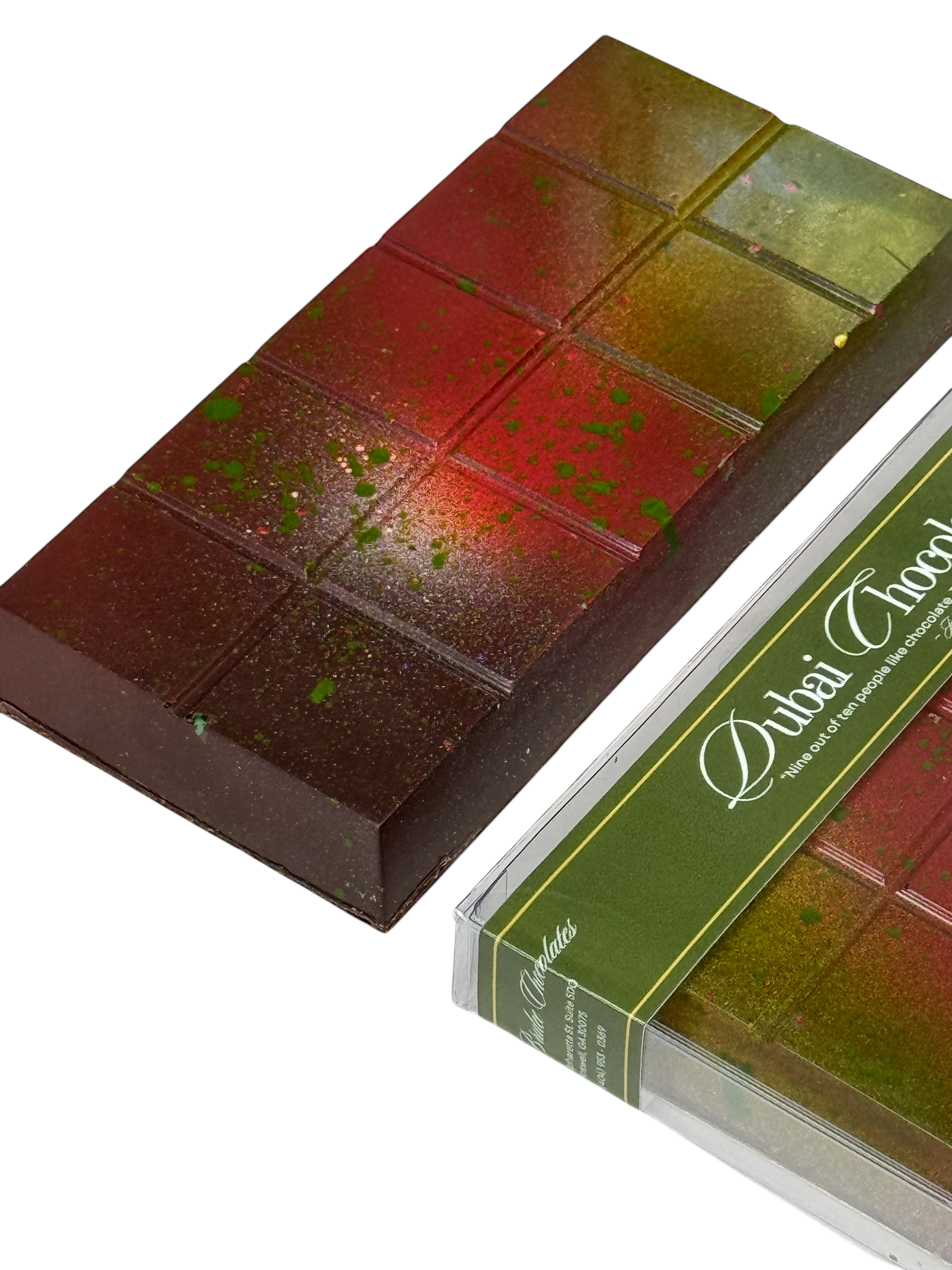 Inspired by the golden luxury of Dubai, this chocolate bar features a silky pistachio ganache and delicate Kataifi crunch — the signature texture loved in popular Dubai confections. Lush, nutty, and perfectly balanced, each bite is a rich escape into indulgence. 6oz.