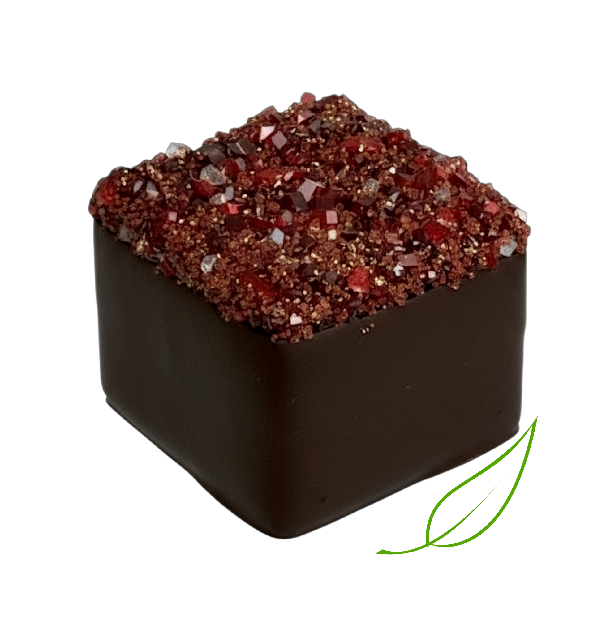 Bright strawberry pâte de fruit wrapped in rich dark chocolate — fruity, juicy, irresistible.